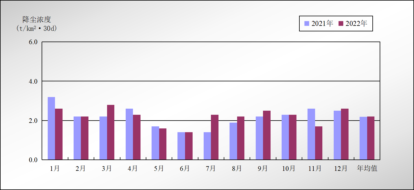 降塵:降塵的月均濃度范圍為1.4~2.8 t/km2·30d,均達到省定標準,達標率100%。年均值為2.2t/km2·30d,低于《浙江省人民政府關于印發浙江省打贏藍天保衛戰三年行動計劃的通知》(浙政發[2018]35號)中對降塵量的要求(5.0 t/km2·30d),與2021年基本持平,具體見圖3-9。