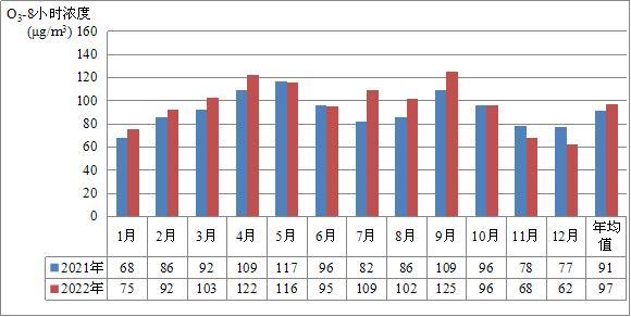 臭氧(O3):臭氧的日最大8小時平均的濃度范圍為12~208μg/m3,年平均濃度為97μg/m3,比2021年上升6.6%,見圖3-6。日最大8小時平均濃度第90百分位數為141μg/m3,按照日最大8小時平均二級濃度限值(160μg/m3)評價,年評價為達標,日評價為全年超標19天,超標率5.2%。