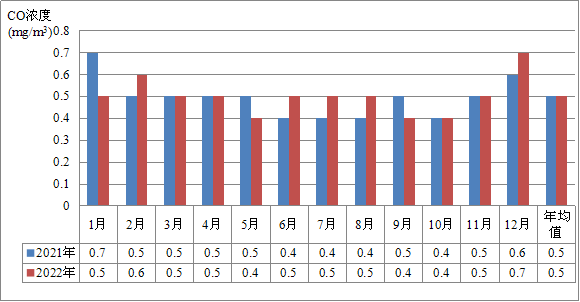 一氧化碳(CO):一氧化碳的日平均濃度范圍為0.2~1.0mg/m3,年平均濃度為0.5mg/m3,和2021年持平,見圖3-5。日均值第95百分位數為0.8mg/m3,按24小時平均二級濃度限值(4mg/m3)評價,年評價為達標,日評價為全年無超標天數。