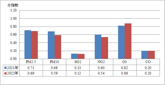 環境空氣質量綜合指數:2022年我縣環境空氣質量綜合指數為3.02,比2021年下降0.12,見圖3-7。各項污染分指數按大小排列依次為O3 (0.88)> PM2.5 (0.69)>PM10(0.59) >NO2(0.54) >CO(0.20)>SO2(0.12)。因此,影響我縣大氣的主要污染物是O3 (占29.1%),其次依次為PM2.5、PM10和NO2,CO和SO2單項指數較低。