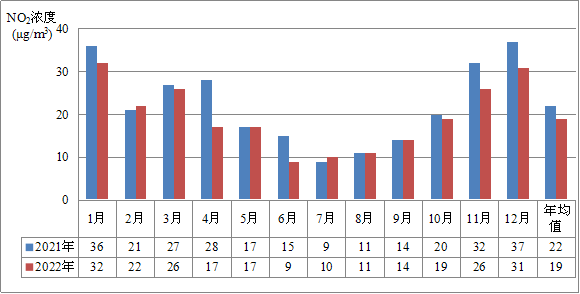 二氧化氮(NO2):二氧化氮的日平均濃度范圍為4~53μg/m3,年平均濃度為19μg/m3,比2021年下降13.6%,見圖3-4。按年平均二級濃度限值(40μg/m3)評價,年評價為達標。日均值第98百分位數為43μg/m3,按24小時平均二級濃度限值(80μg/m3)評價,年評價為達標,日評價為全年無超標天數。